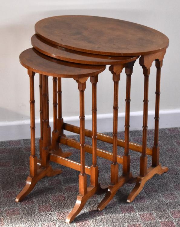 Lot 94 of 142: A nest of three walnut crossbanded oval occasional tables raised on ring turned supports, largest table 56.5 x 37.5cm.