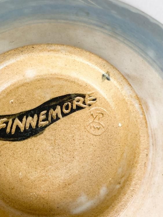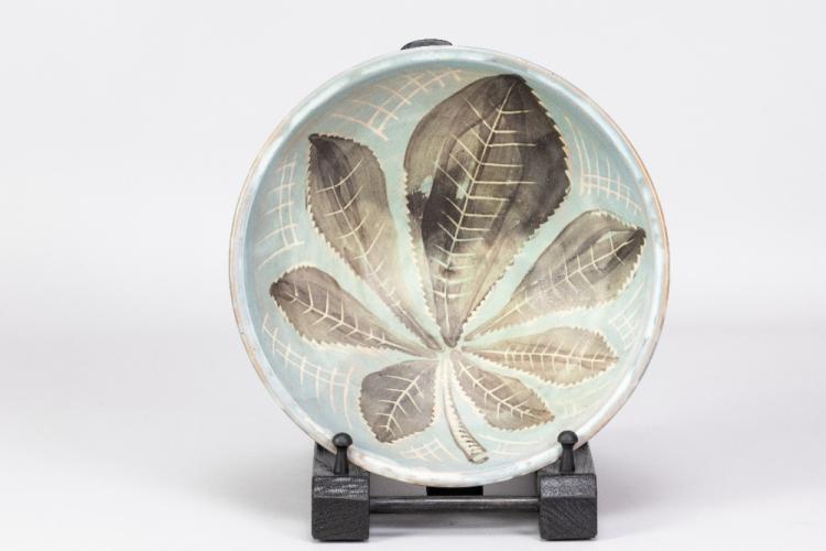 Lot 6 of 424: SYBIL FINNEMORE for Yellowsands Pottery; a stoneware footed dish with incised and painted leaf decoration, incised signature and pottery mark, made circa 1930, diameter 24cm. (D) PR – Having studied at the Central School of Arts and Crafts during the mid 1920s, Finnemore ran the Yellowsands Pottery in Bembridge, Isle of Wight, with her husband T R Parsons. Her work is very rare and she was one of the very first women to start a studio pottery.