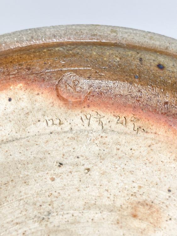 Lot 63 of 424: NORAH BRADEN (1901-2001); an unglazed stoneware dish, impressed NB mark and incised code, made late 1930s, diameter 19.5cm. (D) Provenance: Katharine Pleydell-Bouverie collection. PR – Braden and Pleydell-Bouverie made quite a few unglazed pots just before and during the war. Katharine said that certain glaze ingredients were very difficult to obtain.