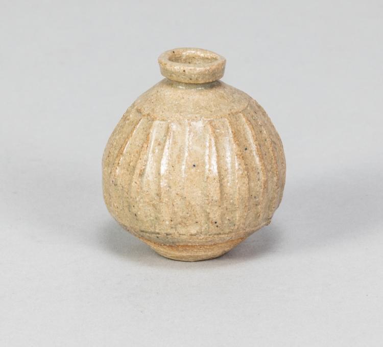 Lot 68 of 424: KATHARINE PLEYDELL-BOUVERIE (1895-1985); a miniature fluted stoneware vase covered in oatmeal glaze, impressed KPB mark, made 1960s, height 5.5cm. (D) Provenance: Artist's collection.