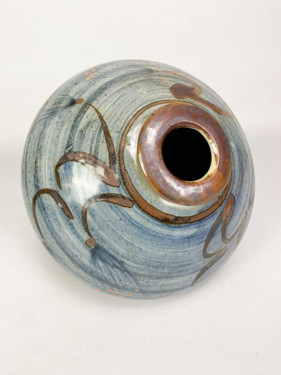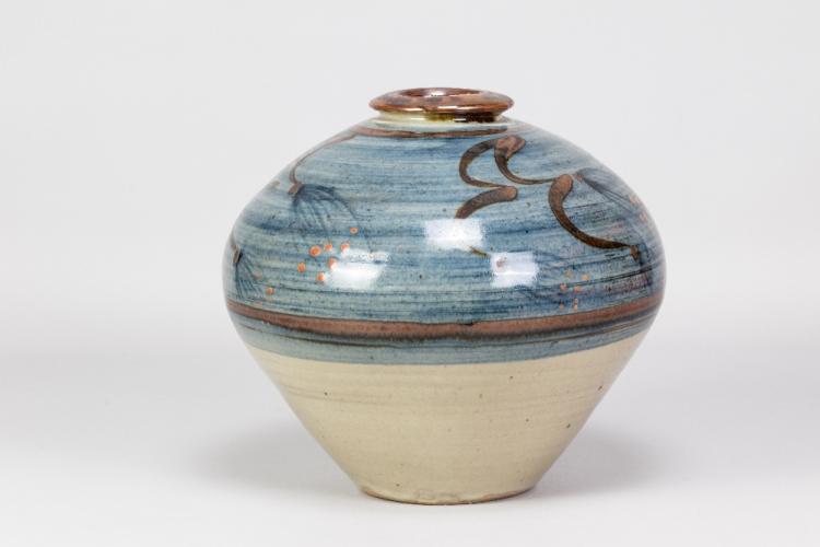 Lot 70 of 424: DAVID LEACH (1911-2005) for Lowerdown Pottery; a large stoneware jar, cobalt wash and painted iron floral motif with trailed red spots, painted DL and impressed pottery marks, made circa 1980, height 24cm. (D) Provenance: Judith Labelter collection. Exhibited: David Leach retrospective touring exhibition, 2003. Literature: Illustrated in Paul Rice, British Studio Ceramics (Crowood Press, 2002), p. 105; Emmanuel Cooper and Kathy Niblett, David Leach (Richard Dennis, 2003), p 100.