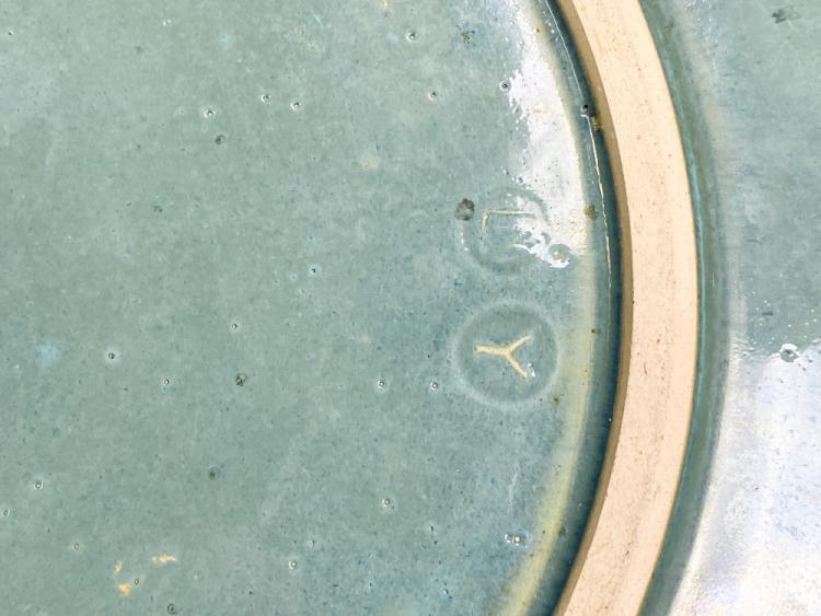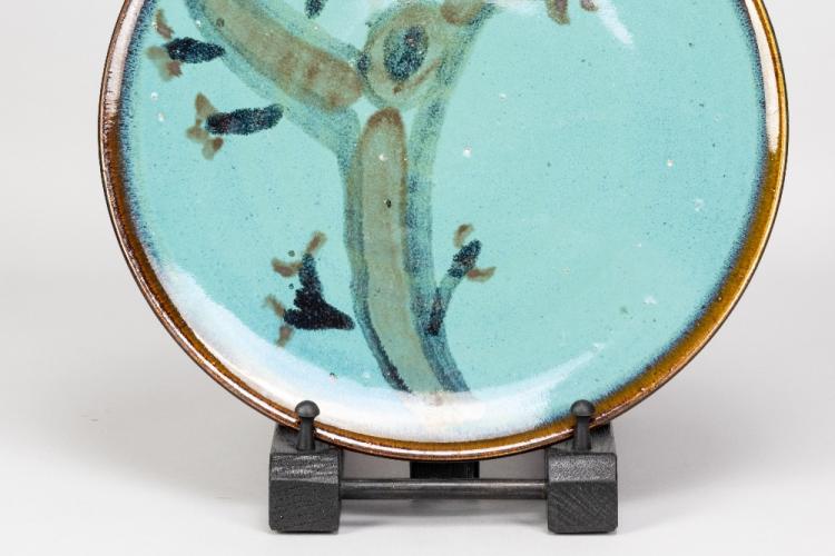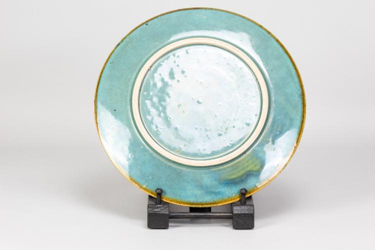 Lot 77 of 424: MICHAEL LEACH (1913-1985) for Yelland Pottery; a large stoneware plate covered in turquoise glaze with iron decoration, impressed ML and pottery marks, made 1960s, diameter 31cm. (D)