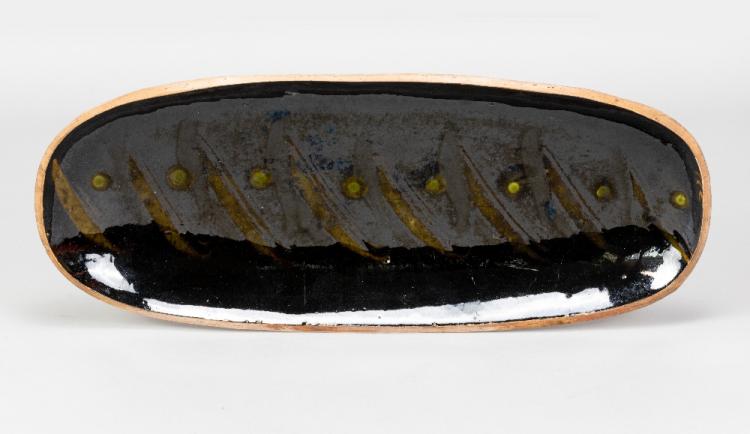 Lot 79 of 424: MICHAEL LEACH (1913-1985) for Yelland Pottery; a long earthenware dish with green decoration on tenmoku ground, impressed pottery marks, made 1960s, length 39cm. (D)