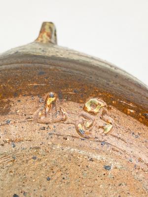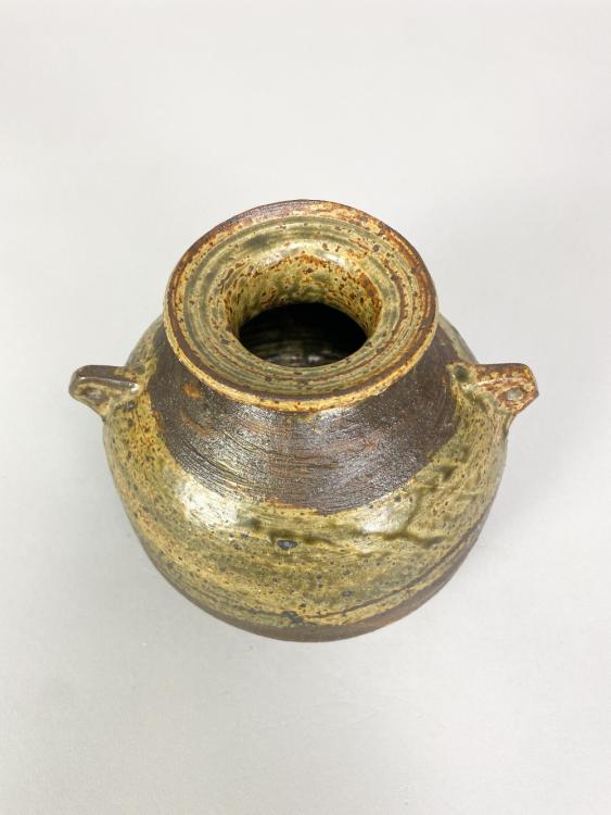 Lot 93 of 424: JANET LEACH (1918-1997) for Leach Pottery; a squat stoneware lugged bottle covered in iron and mottled green glaze, impressed JL and pottery marks, made 1980s, height 14cm. (D) Provenance: David Whiting collection.