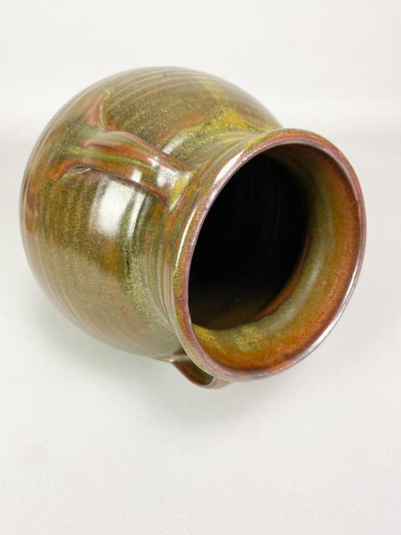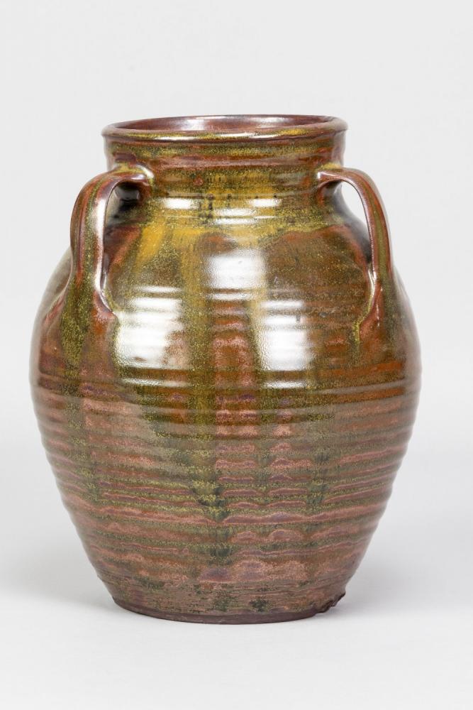 Lot 112 of 424: MICHAEL CARDEW (1901-1983) for Abuja Pottery; a stoneware three handled vase with ribbed body covered in iron rich and green glaze, impressed MC and pottery marks, height 24cm. (D)