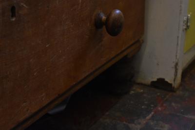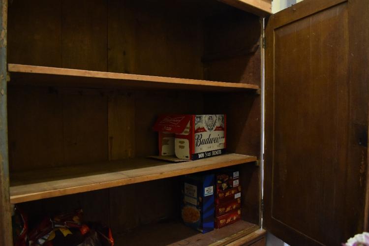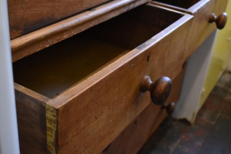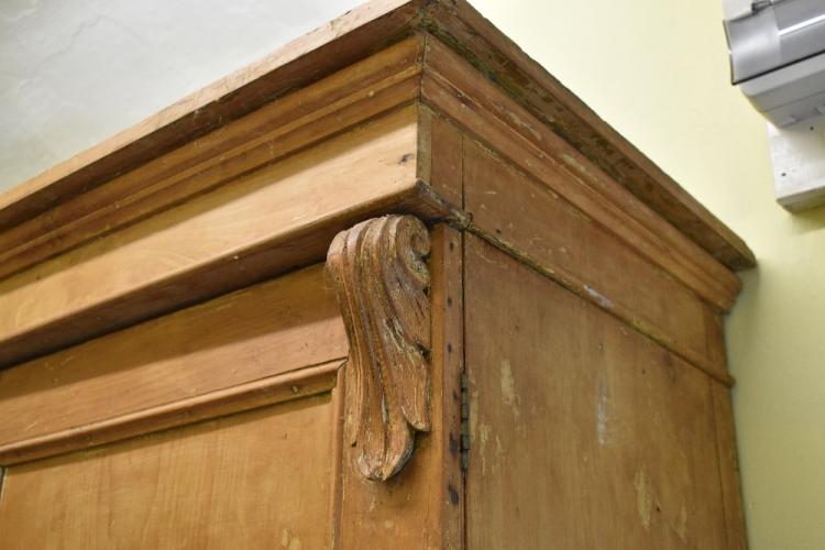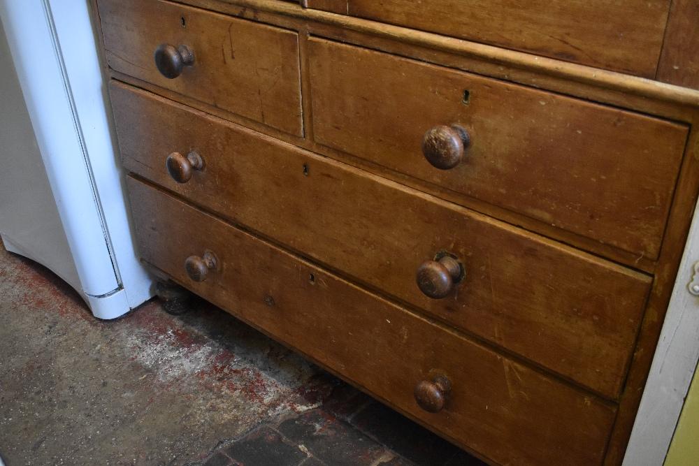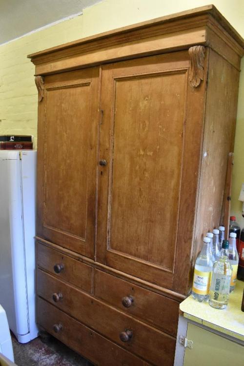 Lot 4000 of 312: A Victorian pine housekeeper's cupboard, with two panelled cupboard doors enclosing shelves above two short and two long drawers, on turned legs, height 215cm, width 129cm, depth 51cm. PROVENANCE: The Raymond Rush Collection. Mr Rush was an engineer, farmer and lay preacher who lived at Golden Cross Farm in Siddington, Cheshire. He was also a historian, broadcaster, author and speaker who regularly gave talks on local history, agricultural history and historic curios. In addition, he was also a