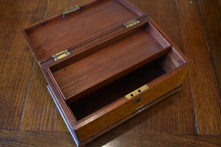 Lot 4006 of 312: A Victorian amboyna box, with internal tray, on bracket feet, height 14cm, width 13cm, depth 18cm. PROVENANCE: The Raymond Rush Collection. Mr Rush was an engineer, farmer and lay preacher who lived at Golden Cross Farm in Siddington, Cheshire. He was also a historian, broadcaster, author and speaker who regularly gave talks on local history, agricultural history and historic curios. In addition, he was also an accomplished maker of corn dollies. PLEASE NOTE: This lot is being sold in-situ fro