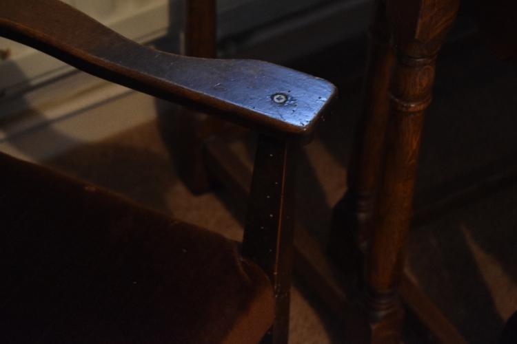 Lot 4009 of 312: A stained beech child's chair, a stained beech sewing chair and an oak occasional table, tallest 70cm (3). PROVENANCE: The Raymond Rush Collection. Mr Rush was an engineer, farmer and lay preacher who lived at Golden Cross Farm in Siddington, Cheshire. He was also a historian, broadcaster, author and speaker who regularly gave talks on local history, agricultural history and historic curios. In addition, he was also an accomplished maker of corn dollies. PLEASE NOTE: This lot is being sold in-