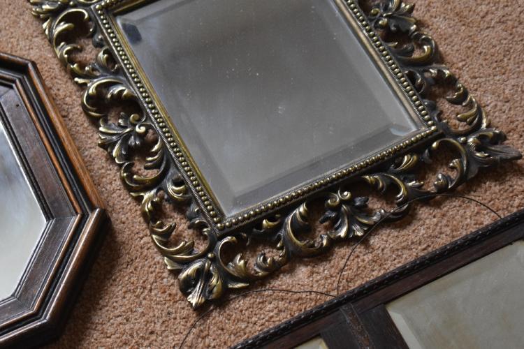 Lot 4022 of 312: A cast brass Florentine style wall mirror, with bevelled plate, height 35cm, also an oak framed twin mirror and two further small mirrors (4). PROVENANCE: The Raymond Rush Collection. Mr Rush was an engineer, farmer and lay preacher who lived at Golden Cross Farm in Siddington, Cheshire. He was also a historian, broadcaster, author and speaker who regularly gave talks on local history, agricultural history and historic curios. In addition, he was also an accomplished maker of corn dollies. PLE