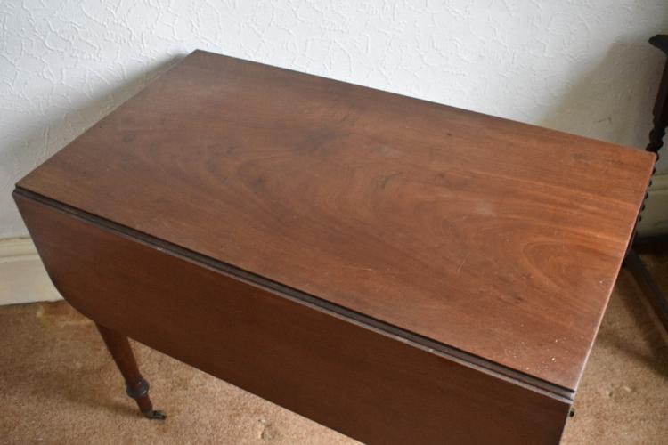 Lot 4024 of 312: An early 19th century mahogany Pembroke table, with drawer and raised on turned and tapered legs, height 69cm, width 91cm, depth when closed 50cm. PROVENANCE: The Raymond Rush Collection. Mr Rush was an engineer, farmer and lay preacher who lived at Golden Cross Farm in Siddington, Cheshire. He was also a historian, broadcaster, author and speaker who regularly gave talks on local history, agricultural history and historic curios. In addition, he was also an accomplished maker of corn dollies.