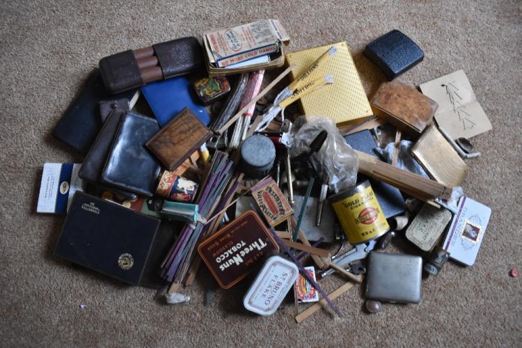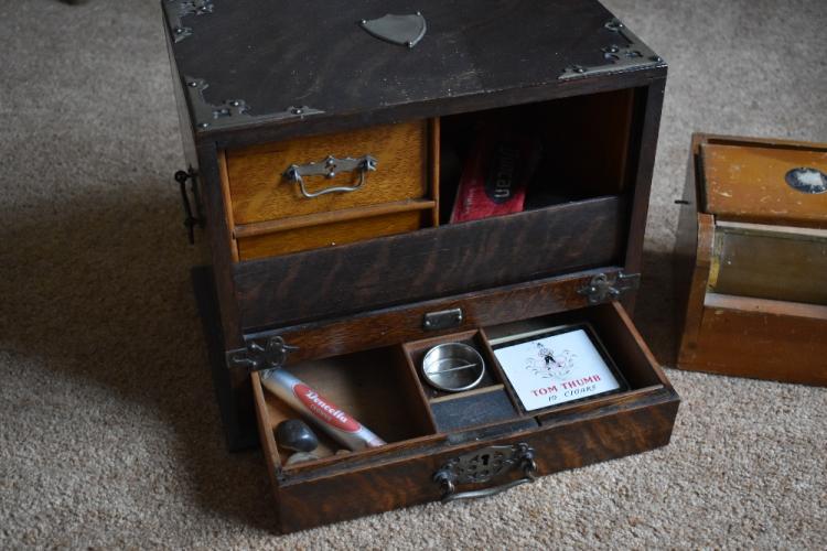 Lot 4027 of 312: A Victorian oak smoker's box with drawer and tambour enclosing a fitted interior, on plinth base, height 25cm, width 31.5cm, depth 22cm, also a selection of smoking related items. PROVENANCE: The Raymond Rush Collection. Mr Rush was an engineer, farmer and lay preacher who lived at Golden Cross Farm in Siddington, Cheshire. He was also a historian, broadcaster, author and speaker who regularly gave talks on local history, agricultural history and historic curios. In addition, he was also an ac