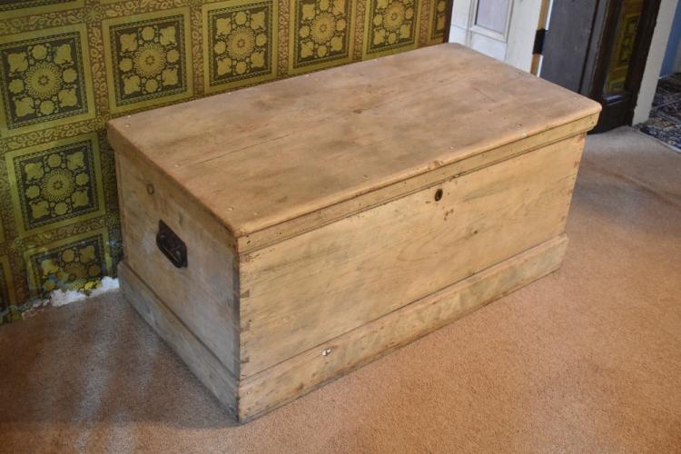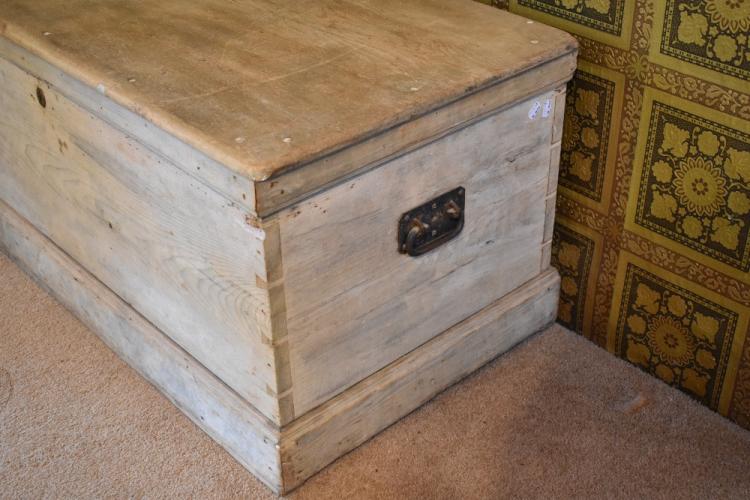 Lot 4043 of 312: A 19th century large pine blanket box, height 52cm, width 116cm, depth 58cm. PROVENANCE: The Raymond Rush Collection. Mr Rush was an engineer, farmer and lay preacher who lived at Golden Cross Farm in Siddington, Cheshire. He was also a historian, broadcaster, author and speaker who regularly gave talks on local history, agricultural history and historic curios. In addition, he was also an accomplished maker of corn dollies. PLEASE NOTE: This lot is being sold in-situ from a local farm house