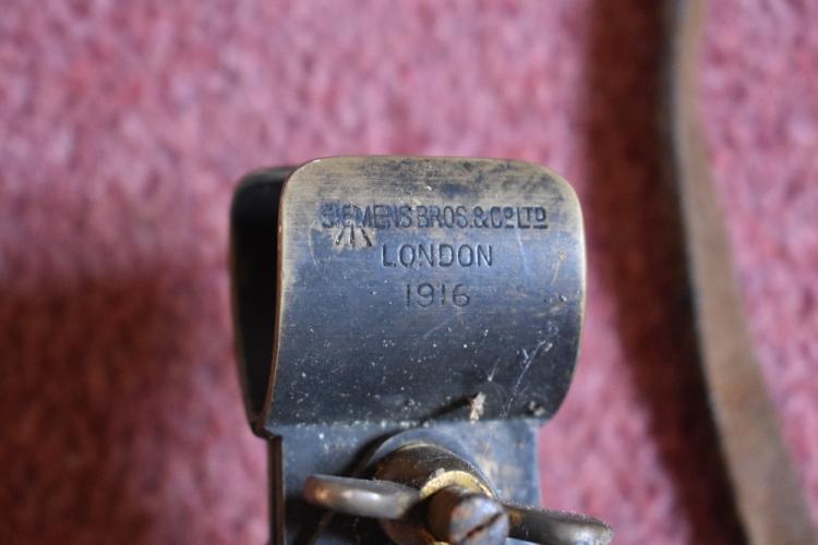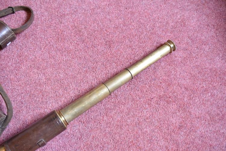 Lot 4045 of 312: A 19th century lacquered brass two draw telescope, with leather mounted barrel, length when extended 61cm, with an associated military issue WWI easel by Siemens Bros & Co Ltd London and dated 1916 (2). PROVENANCE: The Raymond Rush Collection. Mr Rush was an engineer, farmer and lay preacher who lived at Golden Cross Farm in Siddington, Cheshire. He was also a historian, broadcaster, author and speaker who regularly gave talks on local history, agricultural history and historic curios. In addi