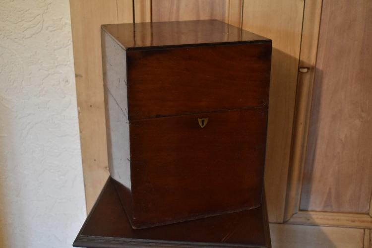 Lot 4047 of 312: A 19th century mahogany rectangular box, possibly a former decanter box, height 28.5cm, also an Edwardian mahogany jardinière stand, height 106cm. PROVENANCE: The Raymond Rush Collection. Mr Rush was an engineer, farmer and lay preacher who lived at Golden Cross Farm in Siddington, Cheshire. He was also a historian, broadcaster, author and speaker who regularly gave talks on local history, agricultural history and historic curios. In addition, he was also an accomplished maker of corn dollies.