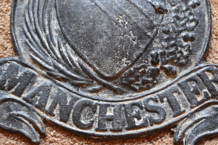 Lot 4048 of 312: A cast lead fire mark for Manchester, height 15cm. PROVENANCE: The Raymond Rush Collection. Mr Rush was an engineer, farmer and lay preacher who lived at Golden Cross Farm in Siddington, Cheshire. He was also a historian, broadcaster, author and speaker who regularly gave talks on local history, agricultural history and historic curios. In addition, he was also an accomplished maker of corn dollies. PLEASE NOTE: This lot is being sold in-situ from a local farm house in Siddington. Collection