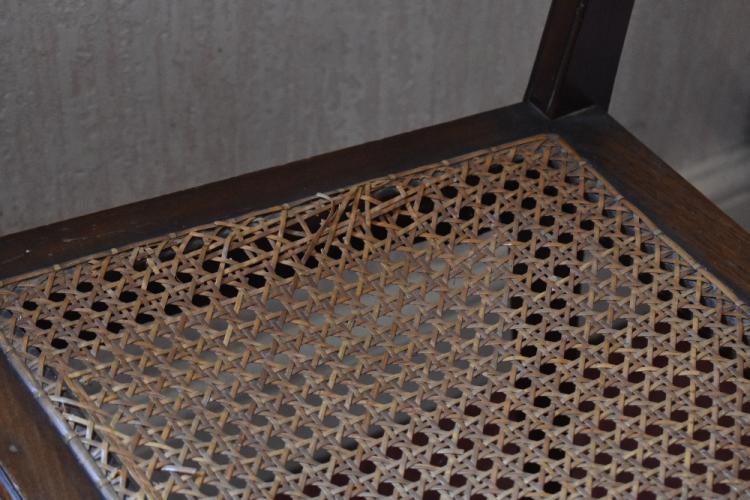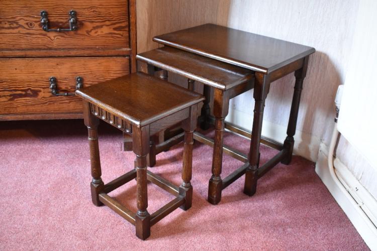 Lot 4060 of 312: An oak nest of three tables, on turned legs, height 47cm, and three cane seat chairs and a cane seat stool (5). PROVENANCE: The Raymond Rush Collection. Mr Rush was an engineer, farmer and lay preacher who lived at Golden Cross Farm in Siddington, Cheshire. He was also a historian, broadcaster, author and speaker who regularly gave talks on local history, agricultural history and historic curios. In addition, he was also an accomplished maker of corn dollies. PLEASE NOTE: This lot is being so