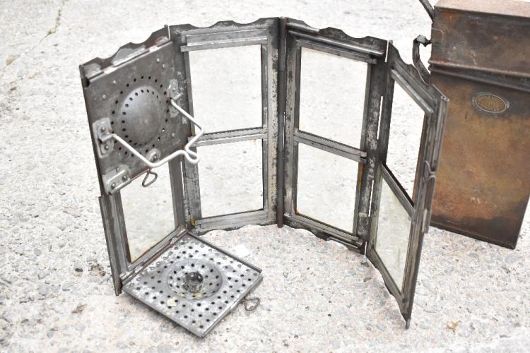 Lot 4065 of 312: JONES & FOSTER BIRMINGHAM; a WWI military issued folding lamp and metal case, the lamp and case with oval maker's labels, height of lamp 33cm (2). PROVENANCE: The Raymond Rush Collection. Mr Rush was an engineer, farmer and lay preacher who lived at Golden Cross Farm in Siddington, Cheshire. He was also a historian, broadcaster, author and speaker who regularly gave talks on local history, agricultural history and historic curios. In addition, he was also an accomplished maker of corn dollies.