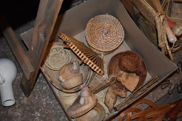 Lot 4207 of 312: Two vintage metal carpet beaters with turned wooden handles, four wicker carpet beaters, a selection of wooden boxes and trays, also a country smock, a lady's leather jacket and a broom. PROVENANCE: The Raymond Rush Collection. Mr Rush was an engineer, farmer and lay preacher who lived at Golden Cross Farm in Siddington, Cheshire. He was also a historian, broadcaster, author and speaker who regularly gave talks on local history, agricultural history and historic curios. In addition, he was als