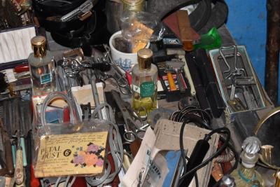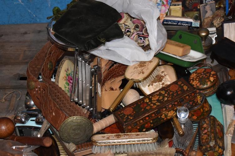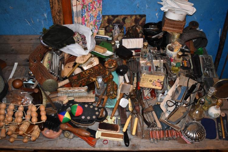 Lot 4208 of 312: A large selection of 19th century and later vintage manicure and clothes items including various hairdressing scissors, hair curlers, clips, etc, four parasols, leather belts, clothes brushes, four alarm clocks, a treen glove stretcher, a treen ring sizer, etc (quantity). PROVENANCE: The Raymond Rush Collection. Mr Rush was an engineer, farmer and lay preacher who lived at Golden Cross Farm in Siddington, Cheshire. He was also a historian, broadcaster, author and speaker who regularly gave tal