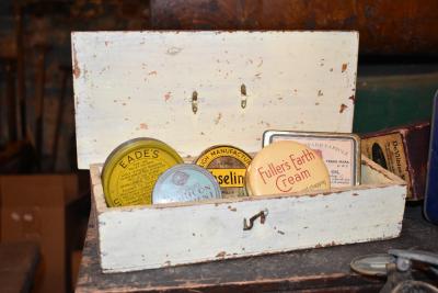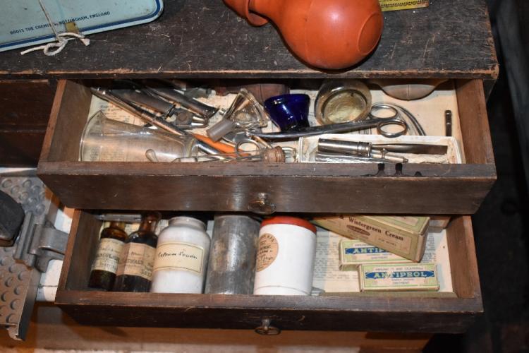 Lot 4212 of 312: A selection of vintage medical and optical items, including a treen pharmaceutical pill tray, a selection of ointment tins, a De Vilbis no.15 instrument in case, and a stained pine four drawer unit enclosing various items including a treen box enclosing a glass bottle with label for Allen & Hanburys Ltd enclosing sterilised silkworm gut, two chemist ointment jars, one with a label for C.W Hobson of Sheffield, the other with a label for J.S. Oswald of Sheffield, and a 19th century brass and steel