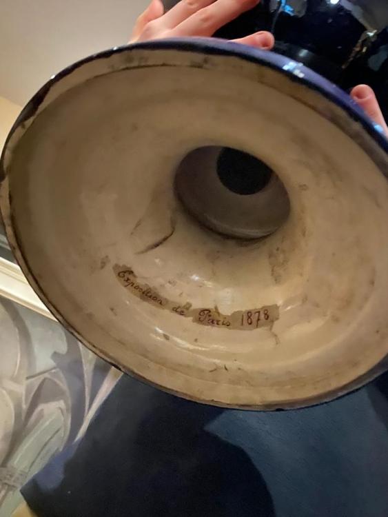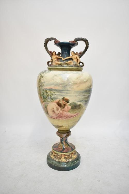 Lot 3 of 3033: DOULTON LAMBETH; a monumental exhibition produced twin handled vase, the lid with swept dragon handles above twin mermen and mermaids, with main ovoid body painted with a maiden holding a lute, waving as a rowing boat departs, with further figures by her side as part of the continuous landscape, the base painted with five stylised fish above a spreading circular foot, impressed marks to base, height 130cm.