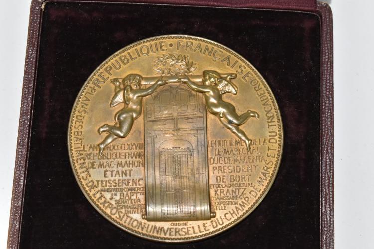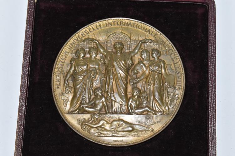 Lot 6 of 3033: PARIS 1878; a large velvet lined leather cased bronze medallion, with gilt tooled inscription to the interior silk of lid 'Sir Thomas White Bart, Membre de la Commission Royale Britannique', diameter 8.5cm.