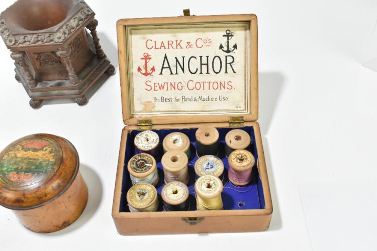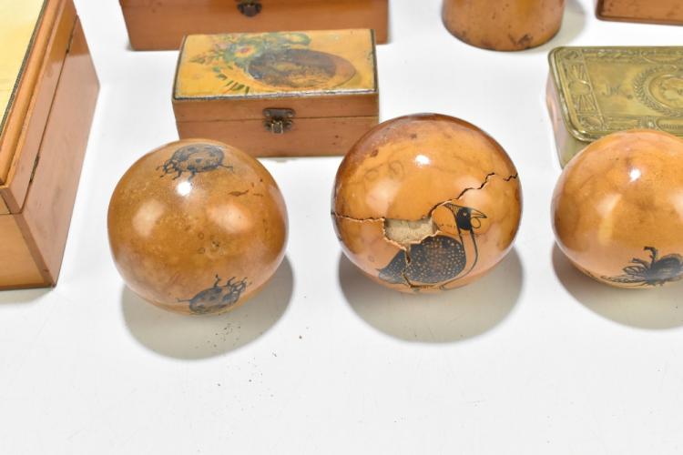 Lot 17 of 3033: VARIOUS EXHIBITIONS; a small group of Mauchline ware including 1889 Glasgow Exhibition, also some painted seed pods, a boxwood model of a font, a WWI Christmas tin, etc.