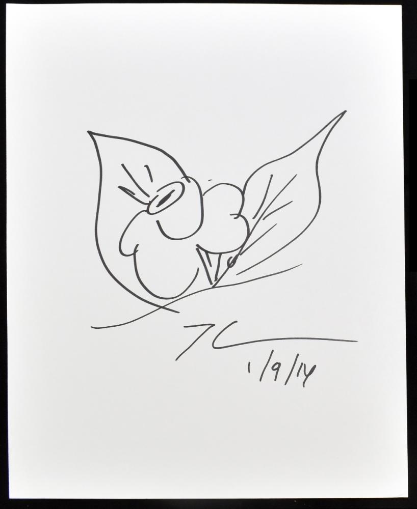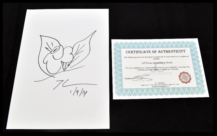 Lot 1536 of 3033: JEFF KOONS (American, born 1955); a black ink sketch on white card, ‘Floral Study’ signed and dated (2014), 30 x 20cm, unframed, with certificate of authenticity from J.C. Autographs.  Provenance: From a private North West collector.