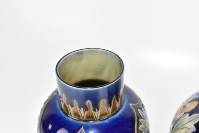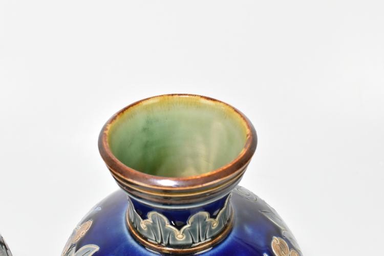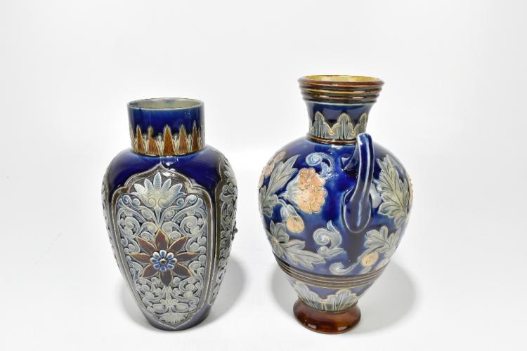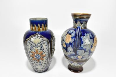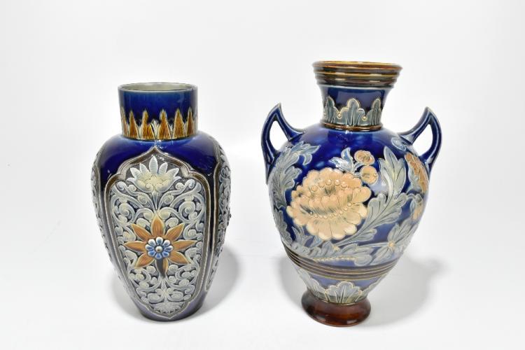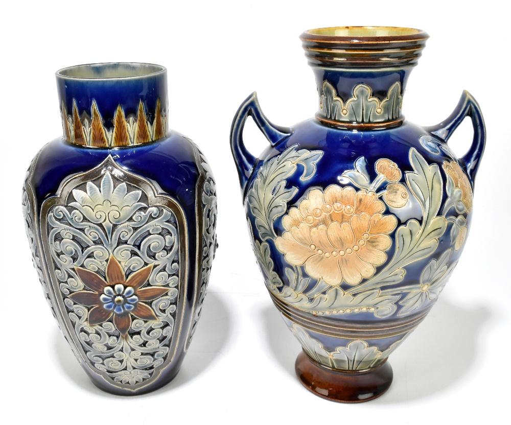 Lot 1626 of 3033: DOULTON LAMBETH; a 19th century twin handled Artware vase, with incised and relief floral decoration, impressed marks and dated 1883 to the underside, height 29cm, together with a further Doulton Artware vase with relief scrolling detail, height 26cm (2).