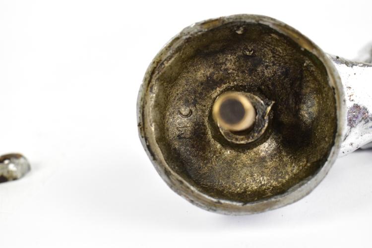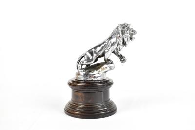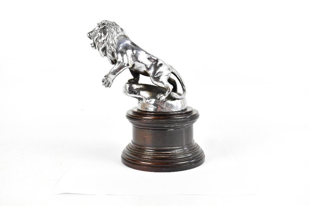 Lot 2009 of 3033: PEUGEOT; a nickle plated car mascot after a design my Morris Marx, modelled as a rampant lion on a circular base, with later ebonised turned wood stand, mascot height 11cm, overall height 18.5cm Provenance: the Richard Martin Cannell (1943-2018) collection, known as 'Martin'