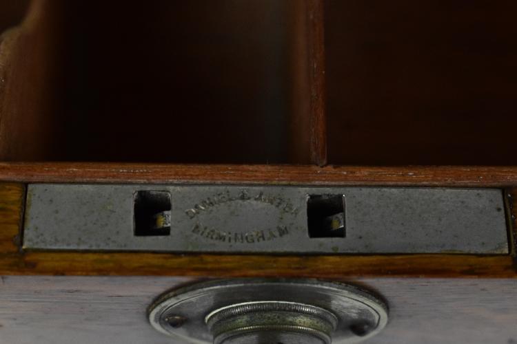 Lot 2167 of 3033: A Victorian plate mounted golden oak tantalus, the raised back enclosing three cut glass decanters and stoppers above a double hinged front and base drawer, height 33, width 38cm, depth 29cm.