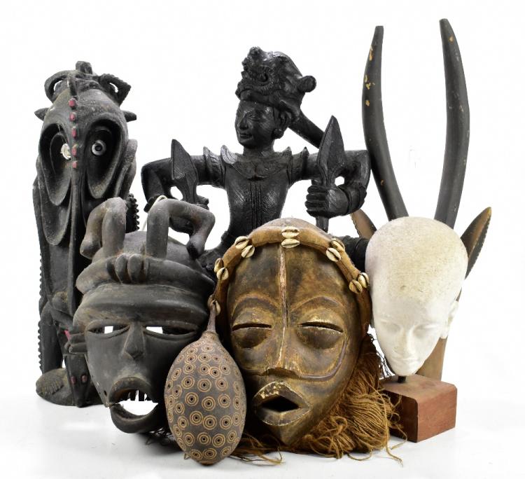 Lot 2180 of 3033: A small group of tribal art including African masks, also an Eastern darkwood carving, etc. PROVENANCE: from the Brian Morley collection.  Brian Morley was born in 1935 in the Peak District, Derbyshire. He had a grammar school education at Buxton College and went on to study at Goldsmiths School of Art (University of London) from 1954-58. He won prizes for drawing and was given the John Murray Award for landscape painting by the Royal Academy in 1956 and 1958. He then studied painting at the