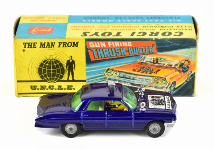 Lot 2224 of 3033: CORGI; a Man from U.N.C.L.E Oldsmobile Super 88, with original folded staging and original outer box, the click gun mechanism to the top of the car is in working order.