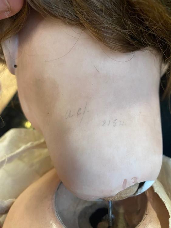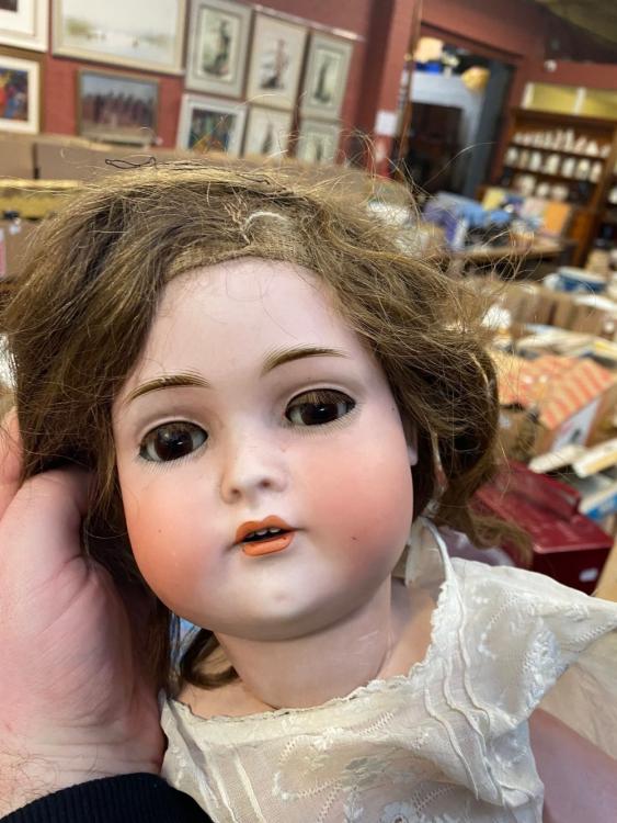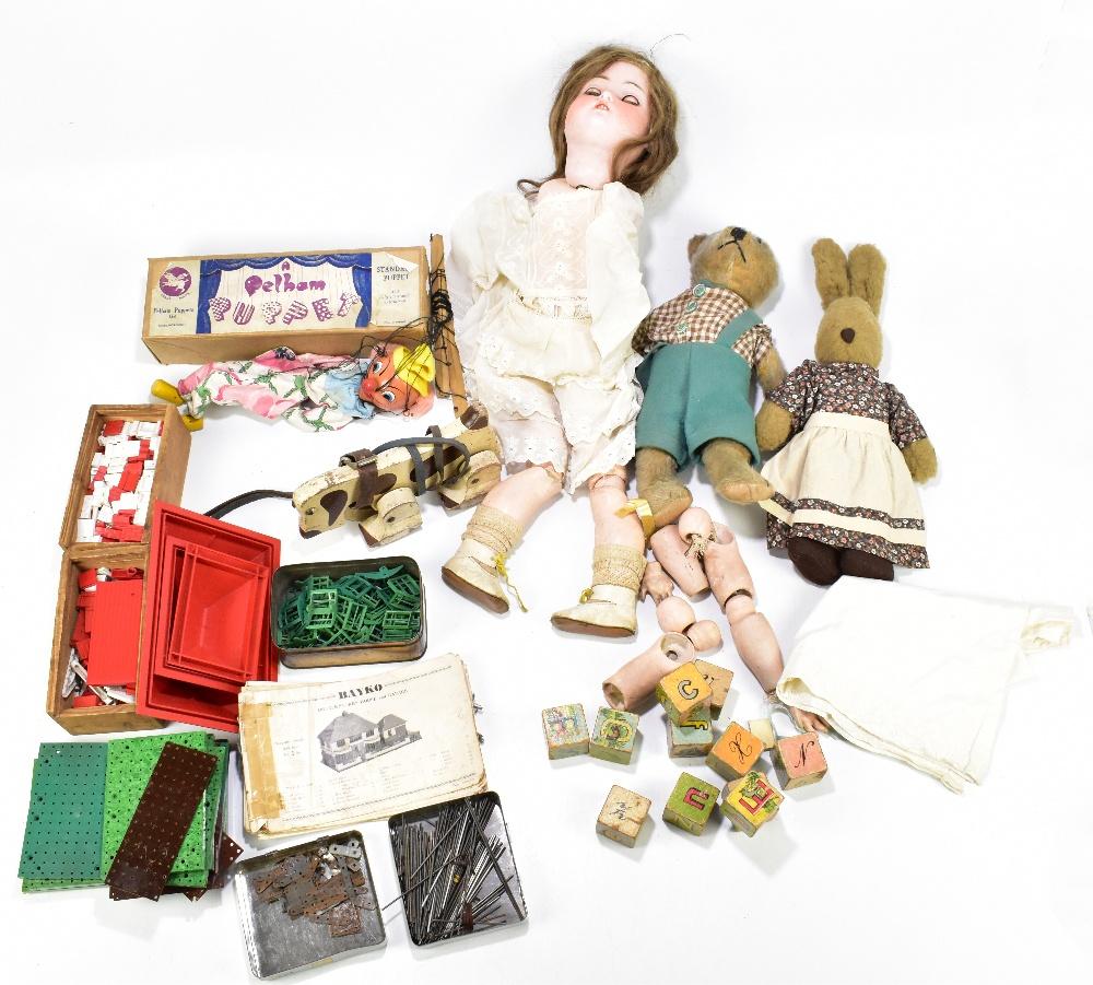 Lot 2240 of 3033: An early 20th century plush bear wearing later dungarees, height 35cm, together with further toys including a plush rabbit, boxed Pelham puppet, a bisque headed doll, etc.