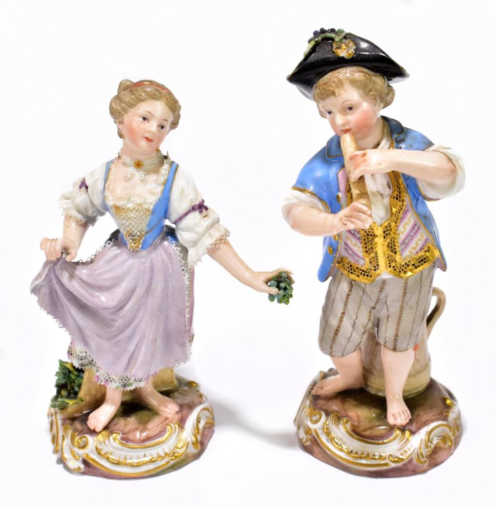Lot 2403 of 3033: MEISSEN; a pair of late 19th century figures representing a boy playing a flute and a girl holding grapes, each wearing crinoline type clothing, blue painted cross sword mark to the underside, height 13cm.