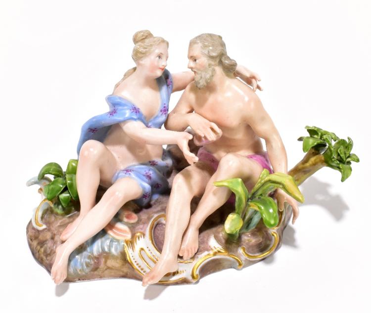 Lot 2404 of 3033: MEISSEN; a 19th century figure group representing a seated couple in naturalistic setting, blue painted cross swords mark and incised 1893 to the underside, height 8cm, length 14cm.