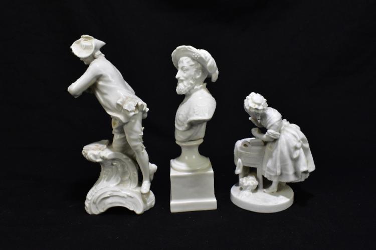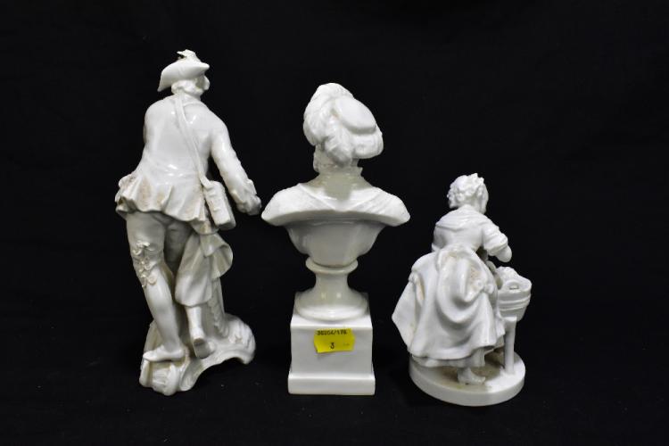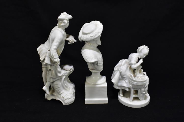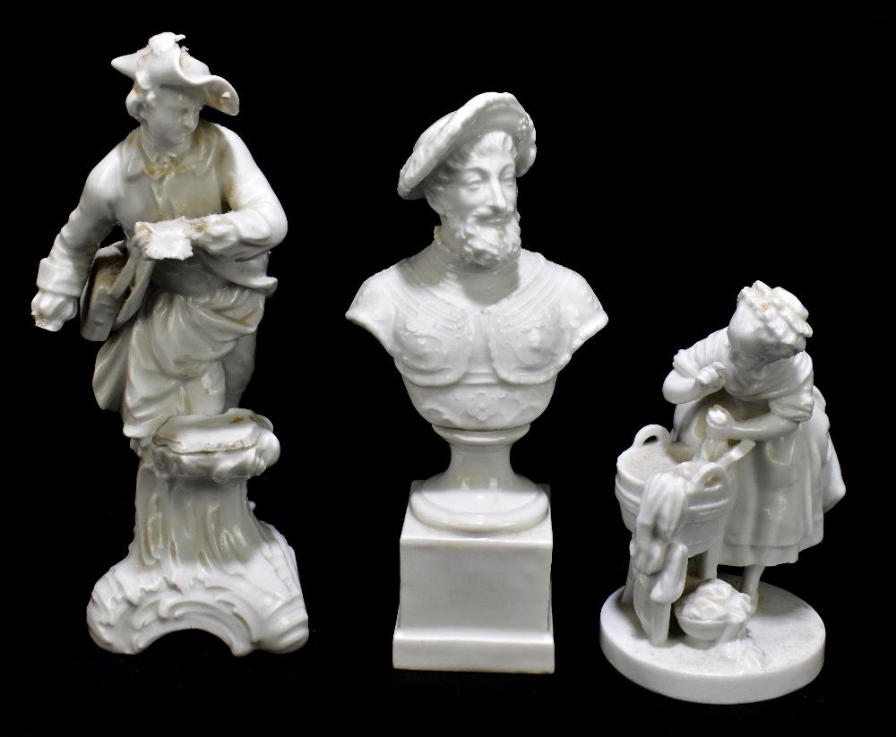 Lot 2408 of 3033: Three 19th century Continental Blanc de Chine figures including a bust of a bearded gentleman, height 19cm, a figure group of a girl beside a bucket of water with pseudo Meissen marks to the base, height 14cm (3).
