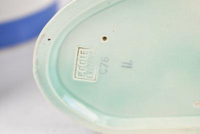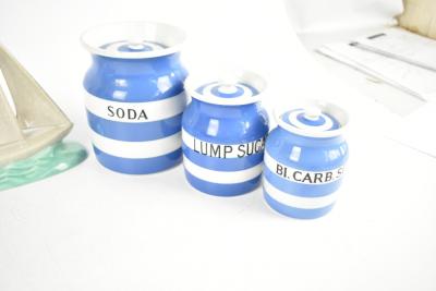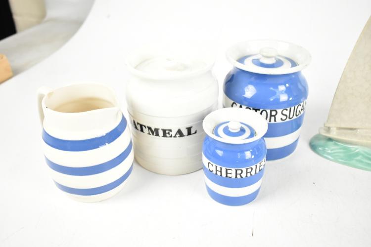 Lot 2676 of 3033: T G GREEN; five assorted Cornish Ware storage jars comprising 'Cherries', height 9cm, with Church mark to the underside, 'Bi. Carb. Soda', 'Caster Sugar', 'Lump Sugar' and 'Soda', also a Mintons storage jar 'Oatmeal', a blue and white jug and a Poole pottery model of a sailing boat (8).