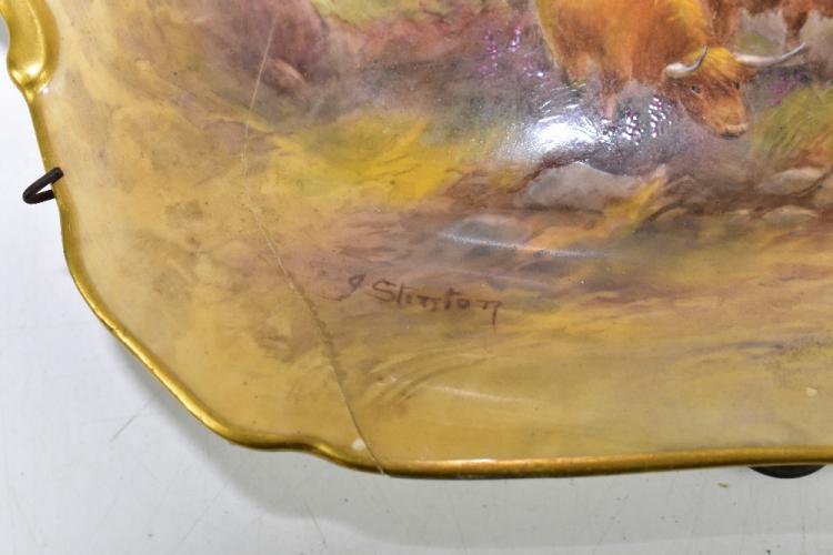 Lot 2682 of 3033: JOHN STINTON FOR ROYAL WORCESTER; a twin handled hand painted square plate decorated with highland cattle, width 28cm (af), together with a Royal Worcester hand painted vase decorated with roses and gilt relief decoration, height 9.5cm (2).