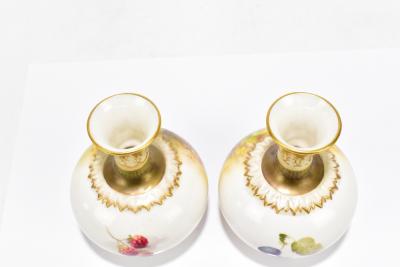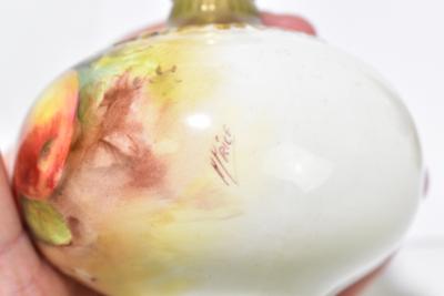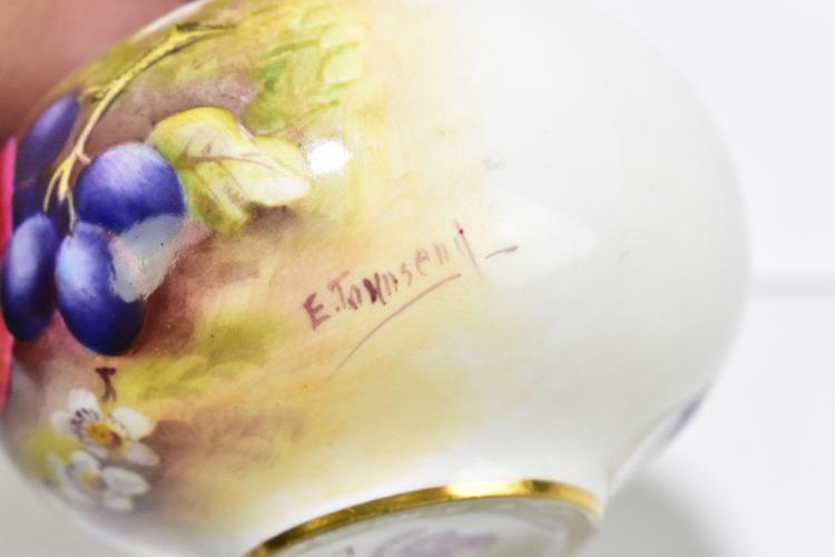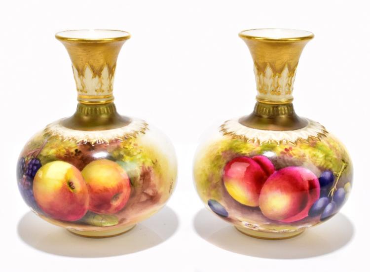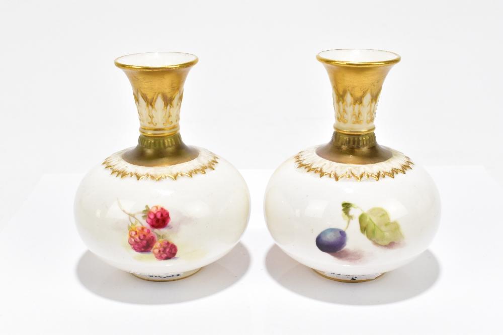 Lot 2683 of 3033: ROYAL WORCESTER; a near pair of hand painted bulbous vases with flared necks, each decorated with fruit, painted by Horace Price and Edward Townsend, each with puce factory marks and numbered F110 to the underside, height is 10.5cm (2).