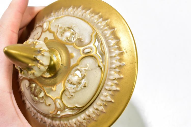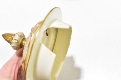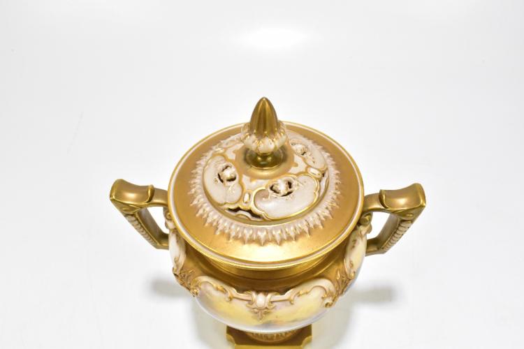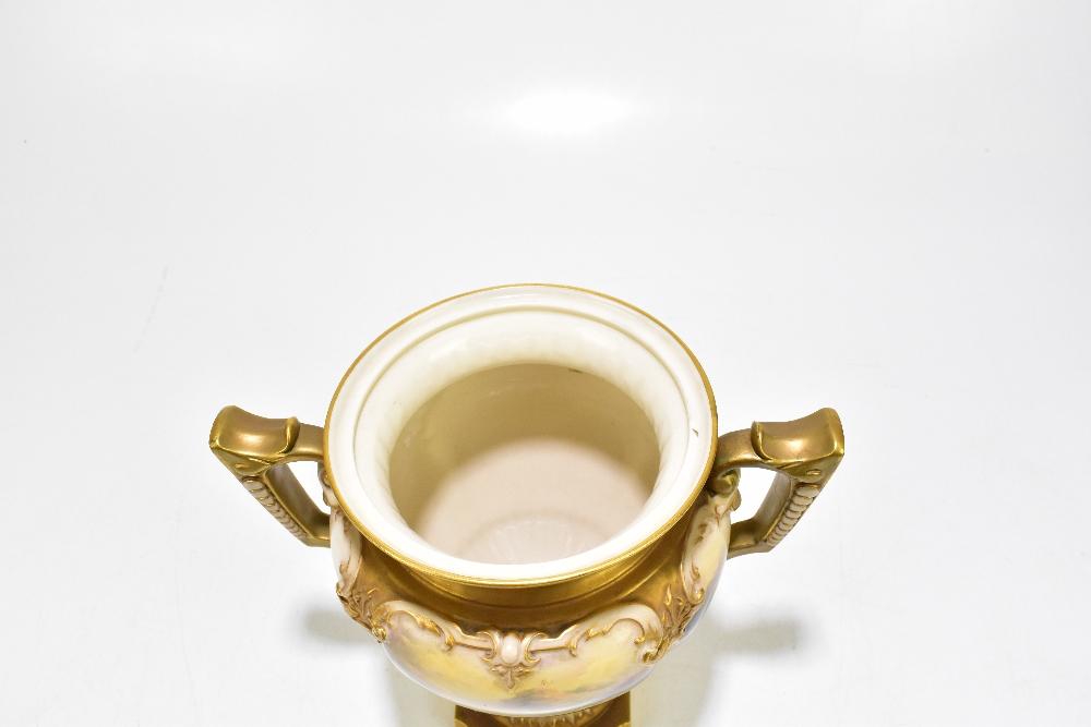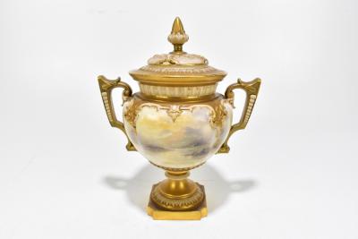 Lot 2684 of 3033: JOHN STINTON FOR ROYAL WORCESTER; an impressive twin handled lidded pedestal urn vase, hand painted with highland cattle in landscape scene, green factory marks and numbered 314 to the underside, height 29cm.