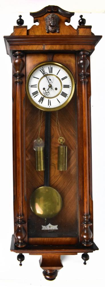 Lot 3228 of 3033: A walnut Vienna regulator, the enamel Roman numeral dial with subsidiary seconds, with eight day movement striking on a gong and supporting two brass weights, height 118cm.