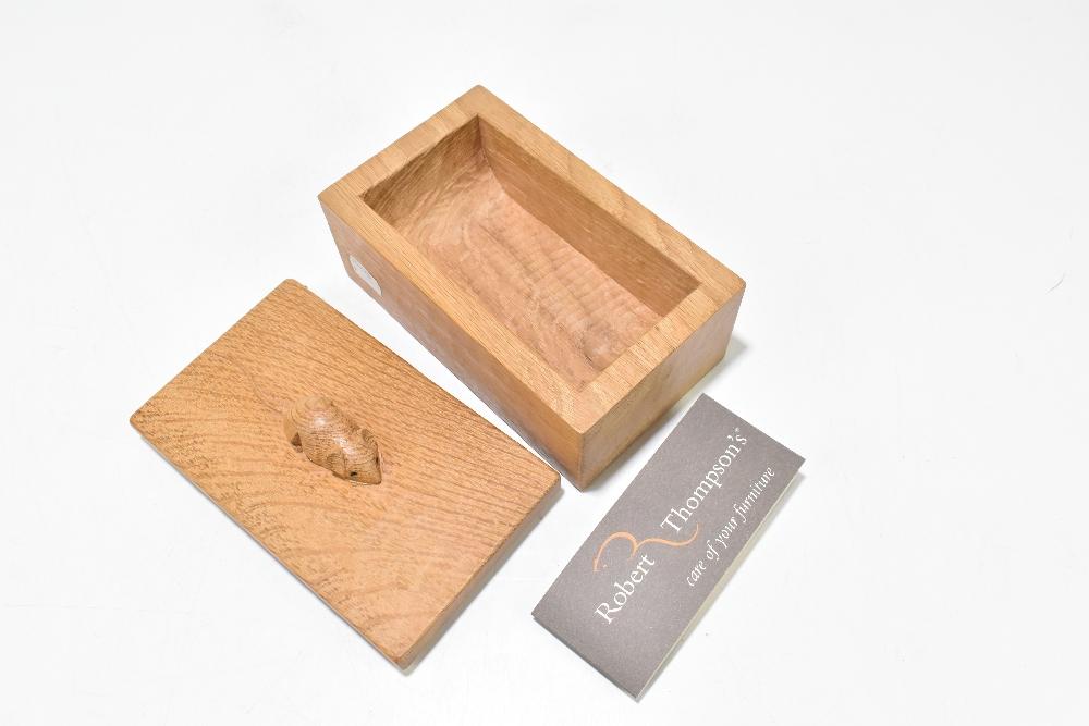 Lot 2161A of 3033: WORKSHOP OF ROBERT 'MOUSEMAN' THOMPSON; a rectangular oak box and cover with signature mouse, length 19cm.