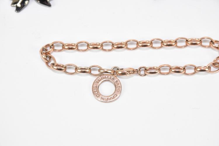 Lot 21 of 2921: AURIGA; an unusual rose gold tone bracelet with tartan pasta shaped bows designed by Patrizia Buscemi, length 20cm, a Thomas Sabo hallmarked silver rose gold chain bracelet with logoed charm and a Daisy London bracelet with gold tone clasp and an 'R' letter charm, in jewellery pouch (3).