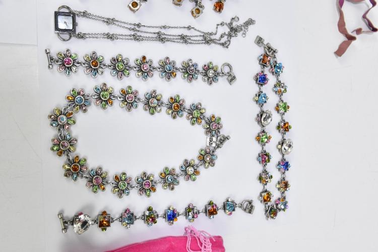 Lot 26 of 2921: RODRIGO OTAZU; a set of multi-coloured gemstone flower shaped necklace in pinks, greens and golds on silver tone metal with matching bracelet, length 46cm, a set of square gemstone with multi-coloured small solitaire shaped stones and large crystals and matching bracelet, length 44cm, an unusual multi-coloured gemstone necklace with butterflies and flower shapes, set with multi-coloured gemstones, a pink and cream large crystal choker with pink velvet tie, all stamped Otazu, two pairs of Supertr