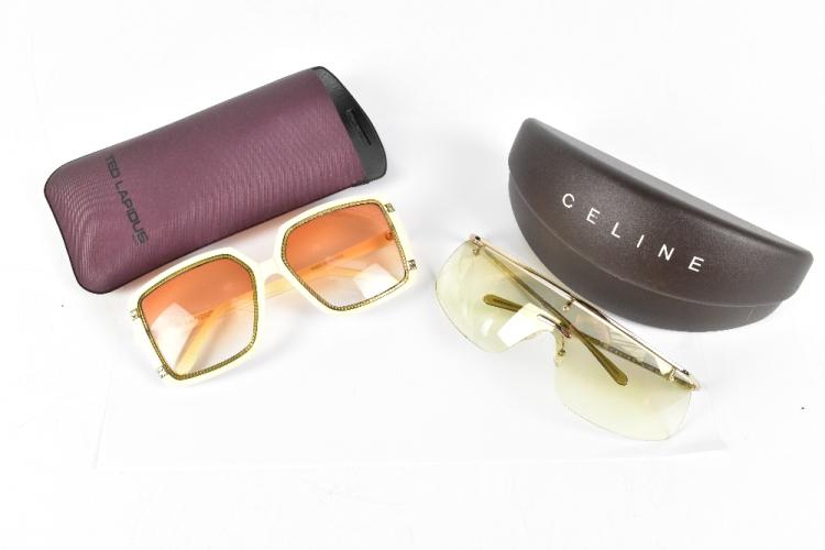 Lot 73 of 2921: TED LAPIDUS PARIS; a pair of vintage 1970s ivory coloured oversized sunglasses with gold tone roped edging, and light amber lenses, signed Ted Lapidus, Paris, with original authentic case and a pair of Celine gold tone framed aviator style sunglasses, signed to edge, in original authentic case (2).