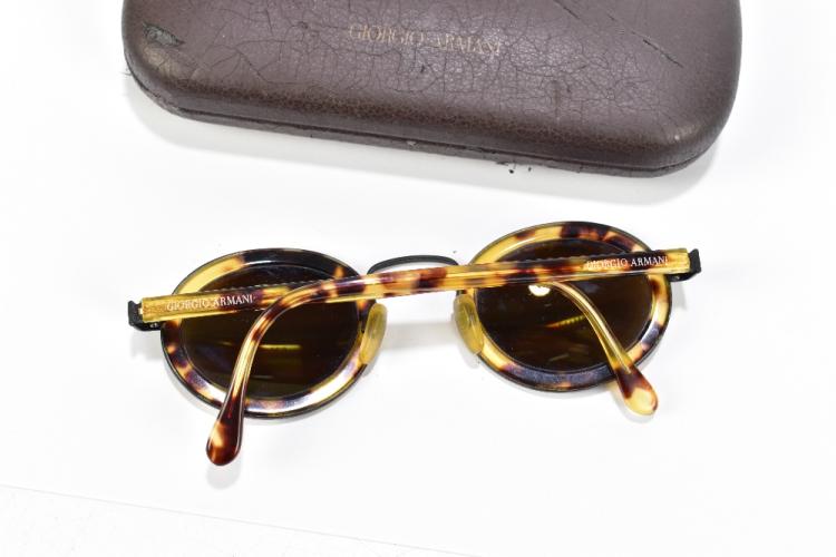 Lot 82 of 2921: GIORGIO ARMANI;  a pair of vintage tortoiseshell round rimmed sunglasses with logo to sides, and dark brown lenses, with original authentic glasses case.