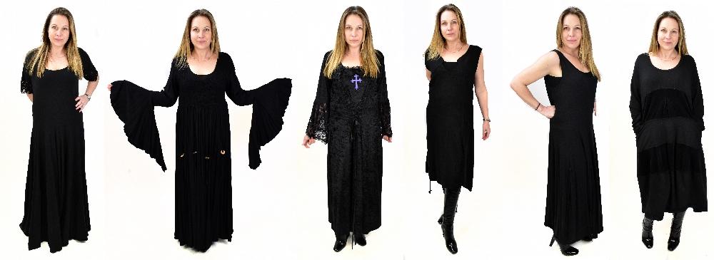 Lot 223 of 2921: SWIRL; a Gothic style black elasticated dress with wide pleated sleeves and embellished with hanging wooden discs to front, one size, a long sleeved velvet Gothic style black medieval dress with lacy wide sleeves and a purple cross embroidered to front, one size, a Labass black linen sleeveless short dress, size large, a full length cotton dress with lace sleeves, a Boris sleeveless long black cotton dress, one size, and a mid-length black and velvet long sleeve dress, made in Italy, one size (6
