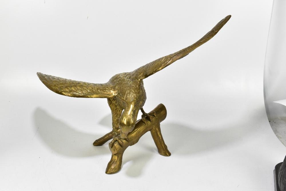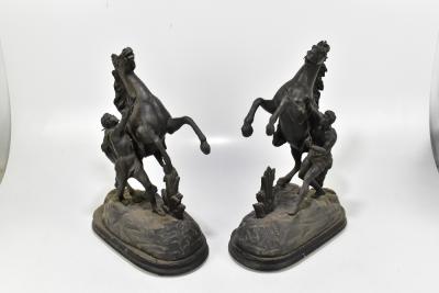 Lot 1315 of 2921: A pair of spelter Marly horses, height 45cm, and a large brass model of an eagle (3).