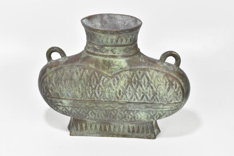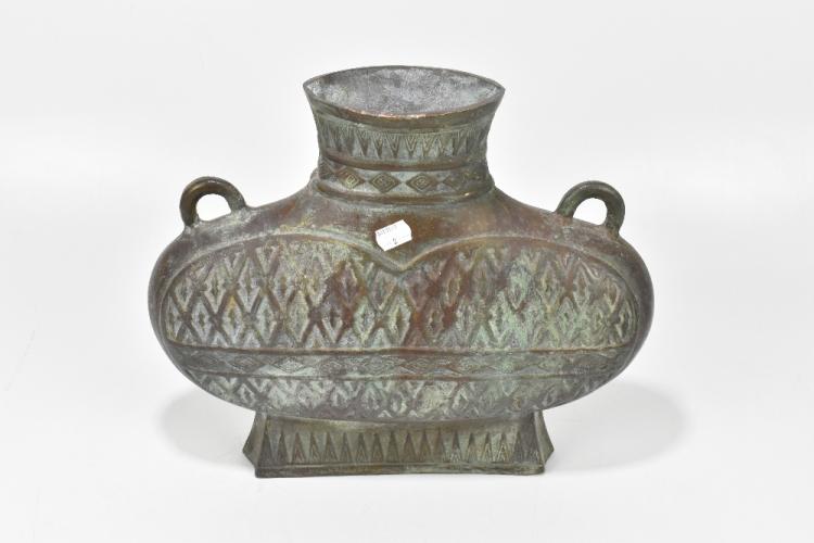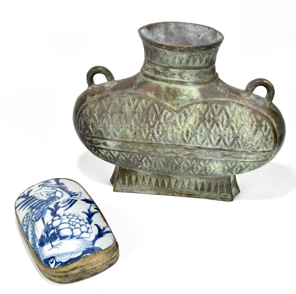 Lot 1317 of 2921: A large decorative twin handled vessel, together with a blue and white box of rectangular form with applied metal detail (2).